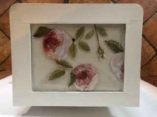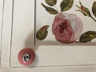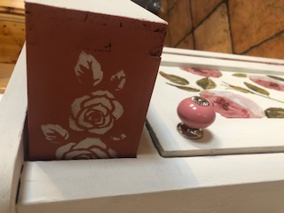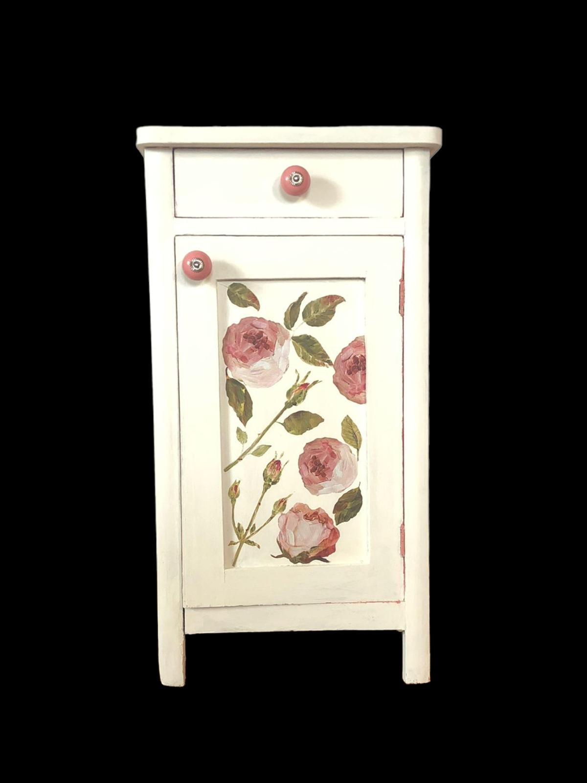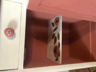 Dieses ausgefallene Unikat wurde im Vintagestil liebevoll restauriert, mit Kreidefarbe bemalt, mit Blumenmuster verziert und anschließend gewachst. Die Farbe ist altweiss, der Innenraum ist altrosa.